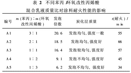 表1 超薄型鋼結構防火涂料的基本配方 1.3涂層的制備 用500,1000號砂紙分別將80mm×80mm×1mm的Q235鋼片打磨至光亮,用3%KFD-1000金屬清洗劑溶液于80℃清洗30min后取出,烘干,備用。將防火涂料充分攪拌后,用毛刷涂覆在Q235鋼片的打磨面上,每次涂覆0.3~0.5mm,保持表面均勻光滑,待涂層表干后涂覆下一次,控制最終涂膜厚度不超過3mm,涂覆比約為0.15kg/m2。將涂好的試片平置,放入烘箱(25℃)內干燥。 1.4耐火性能測試 采用垂直燃燒方法進行簡易評價[4],這也是防火涂料研究的通用方法。 2結果與討論 2.1基料配比對耐火時間的影響 2.1.1乳液復配比例苯丙乳液做基料膨脹發泡好,但結構疏松,空氣對流強時易吹落;環氧改性丙烯酸乳液做基料,附著力優異,結構堅硬致密,但膨脹發泡高度不夠。將二者結合則能克服缺點,突出優點。表2表明,苯丙乳液與環氧改性丙烯酸乳液用量質量比為2∶1時,涂料的耐火時間最長,發泡好,炭層堅硬致密。