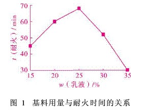 表2 不同苯丙/環氧改性丙烯酸混合乳液質量比對涂料耐火性能的影響 2.1.2基料樹脂用量 由圖1可見,基料樹脂用量對防火涂料的耐火性能有很大影響:樹脂用量(質量分數)為15%~25%時,耐火時間延長;繼續增加用量,耐火時間反而縮短。其原因是樹脂用量少,不能起到和基材粘結的作用,形成的炭質層容易脫落;樹脂用量過多時,膨脹阻燃體系含量減少,不能形成很好的炭質層。因此,適量的基料樹脂能保證很好的耐火性能。基料最佳用量為25%。